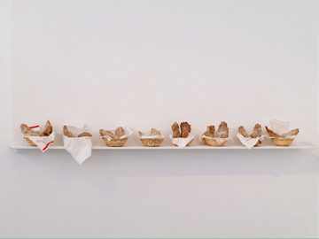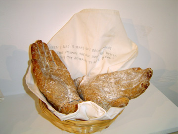The Table, images of each woman’s hands cast in bread, have been transferred onto the surface of a 100 year old Adrigole kitchen table together with recipes for our baking and snippets of stories and conversations. Incorporated within the table is the sound piece -
